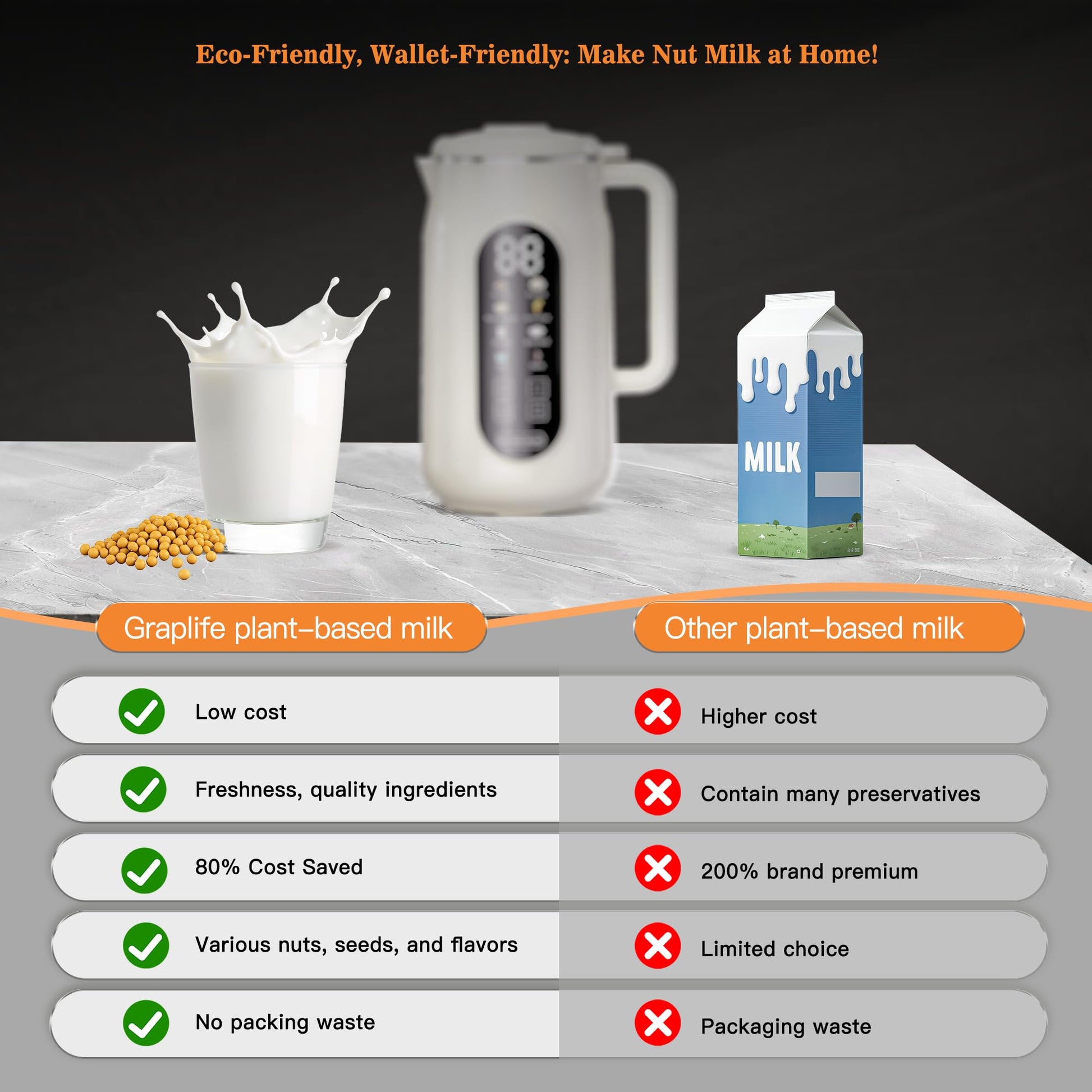 - 10-in-1 Super Nut Milk Maker -- 42oz large capacity. One powerful nut milk maker handles blending, soy milk, purees, juicing & more. It can easily make almond milk, oat milk, soy milk, juices, rice porridge, smoothies, plus heating & warming. No soaking required – just load, blend, and serve. Perfect for families of 3-5, from quick breakfasts to gatherings. The space-smart design clears counter clutter by replacing multiple appliances. More versatility, less hassle.