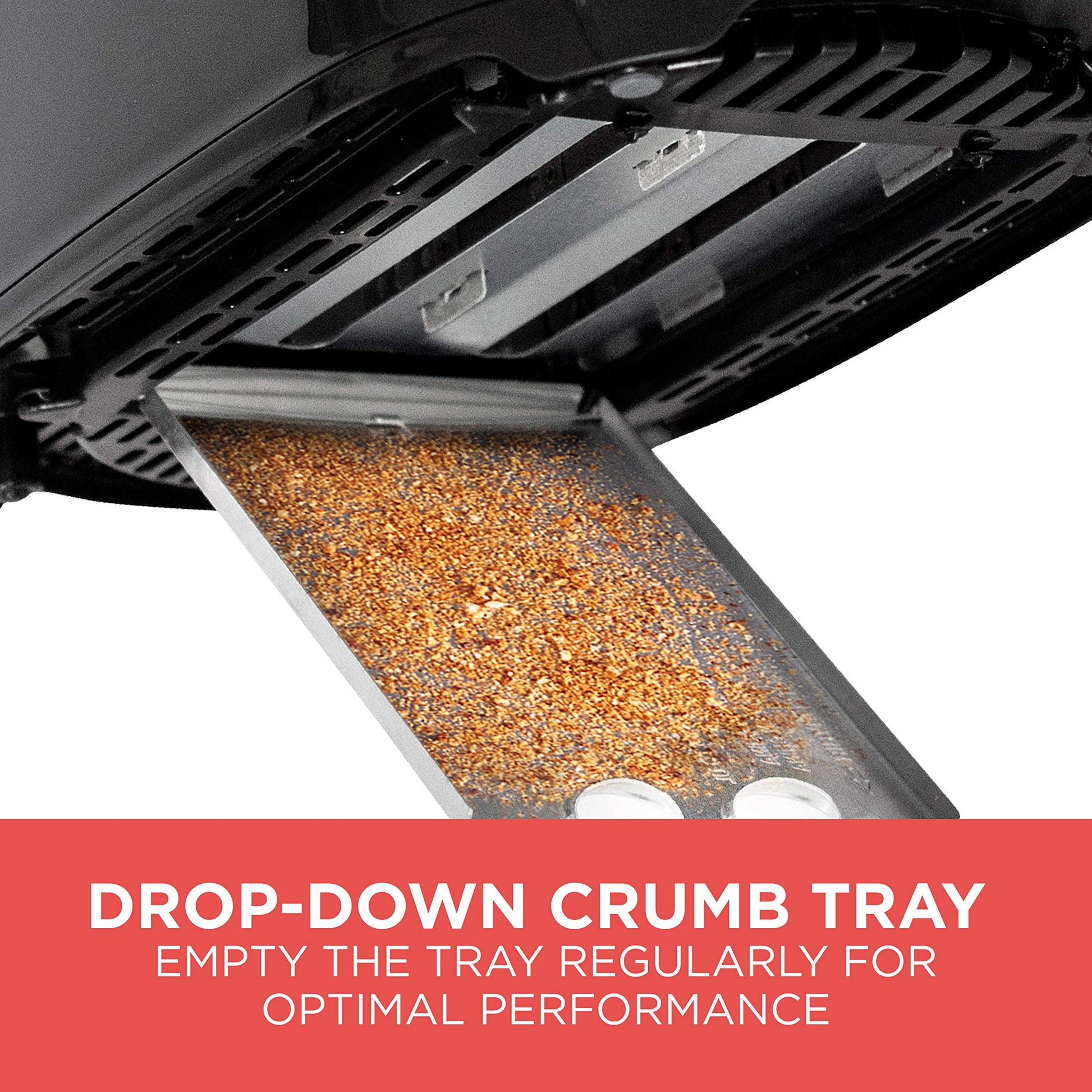- DROP DOWN CRUMB TRAY - Keep the counter clean and the kitchen smelling fresh. The crumb tray lets you remove crumbs before they burn or mess up your kitchen.