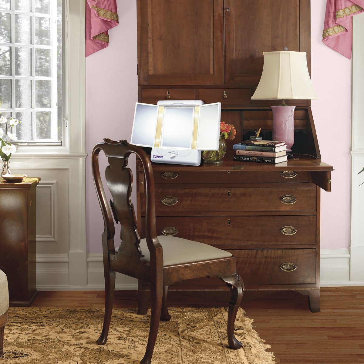 Details: The beauty of this mirror comes with 4 light settings simulating evening, day, home, and office light, and 3 panels for wide angle viewing.