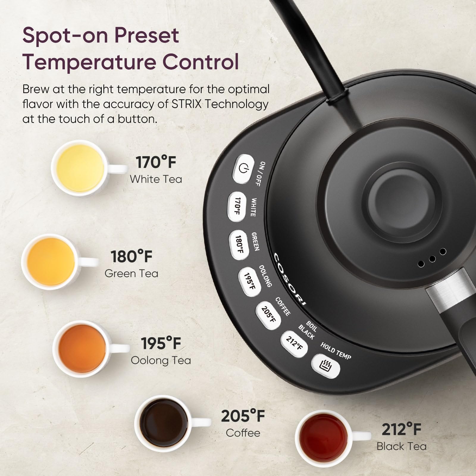 - 5 πΆππ-π»ππππ π·ππππππ: Your Gooseneck Electric Kettle features 5 precise temperature presets. These accurate presets make brewing coffee or tea a breeze