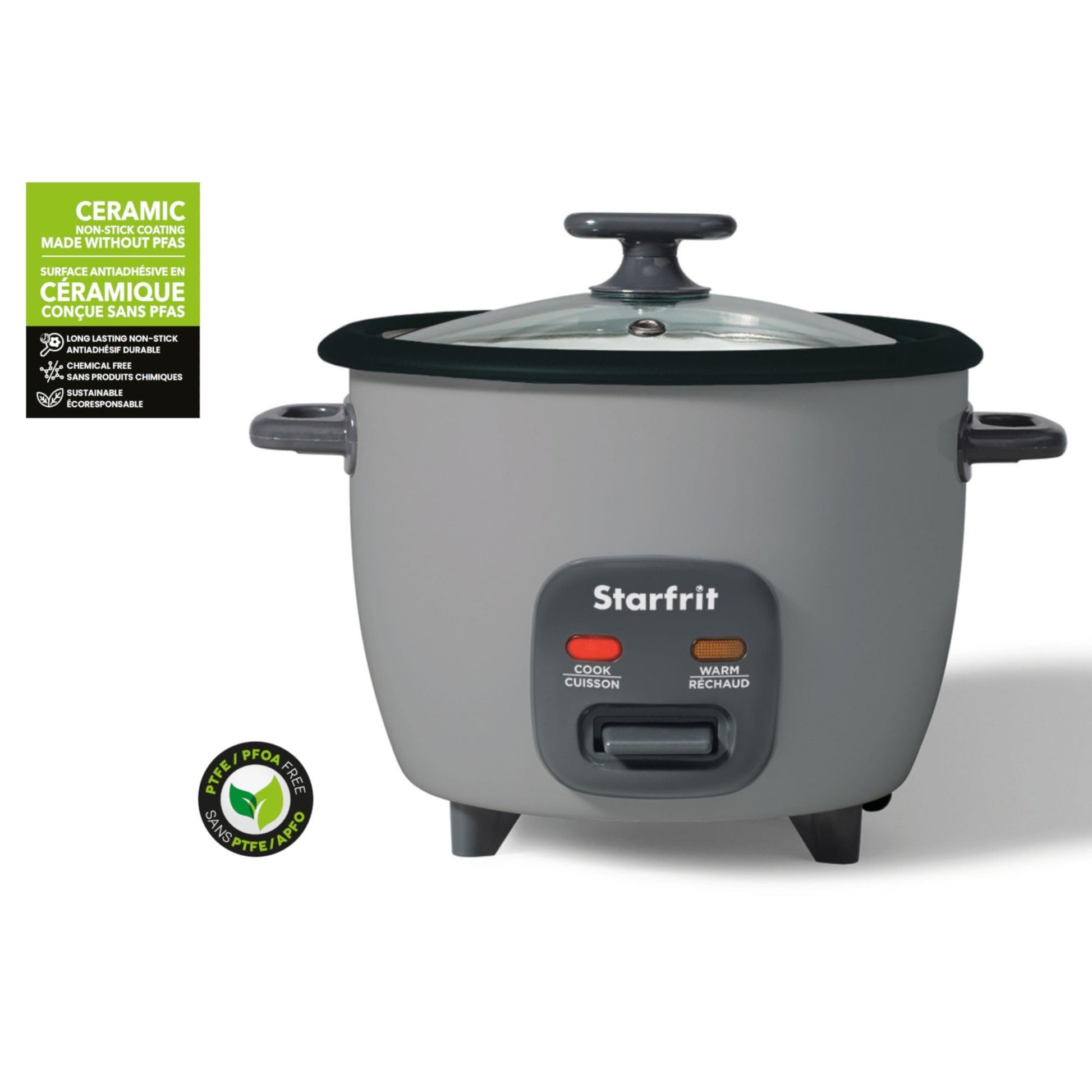 - The Starfrit 10 Cup Non-Stick PFAS-Free Ceramic Electric Rice Cooker features a PTFE/APFO and PFAS-free ceramic cooking pot for healthy cooking.